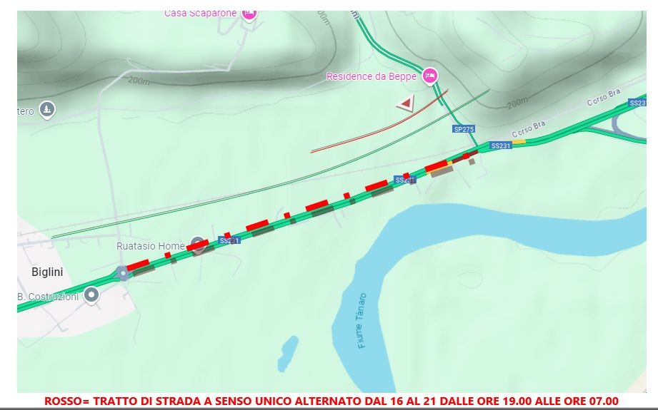 Per lavori di manutenzione straordinaria e rifacimento della segnaletica orizzontale, da lunedì 16 a sabato 21 settembre dalle ore 19.00 alle ore 7.00, senso unico alternato con semaforo mobile o movieri, sulla Strada Statale 231, nel tratto compreso tra il passaggio a livello in frazione Scaparoni e l’intersezione con via Garelli sulla rotatoria in corso Unità d’Italia, zona Piana Biglini di Alba.