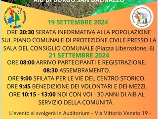 Nell’ambito dell’evento “Noi con voi – 30 anni insieme – AIB Borgo an Dalmazzo”, organizzato in occasione del trentennale della sua attività dall’AIB Associazione Antincendi Boschivi e Protezione Civile Borgo San Dalmazzo in collaborazione con il Comune di Borgo San Dalmazzo, verrà proposto un incontro informativo per la presentazione del Piano Comunale di Protezione Civile.