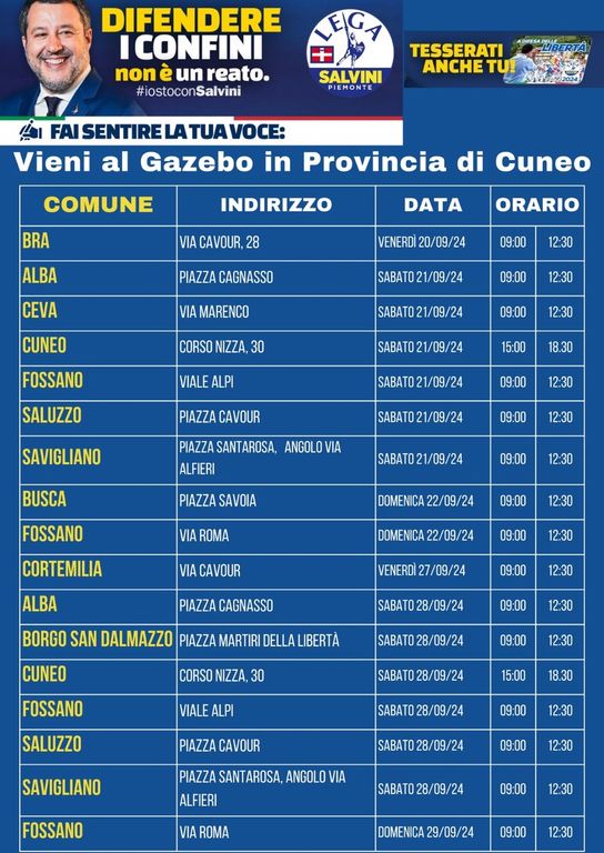 L’iniziativa della Lega tocca anche la provincia di Cuneo, dove, sabato 21 e domenica 22, e poi ancora sabato 28 e domenica 29 settembre, sarà possibile firmare per sostenere il Ministro Matteo Salvini nella sua battaglia a tutela di tutti gli italiani ma anche per dire “sì” alle grandi riforme volute e messe a punto dalla Lega: il DDL Sicurezza e l’Autonomia Differenziata.
