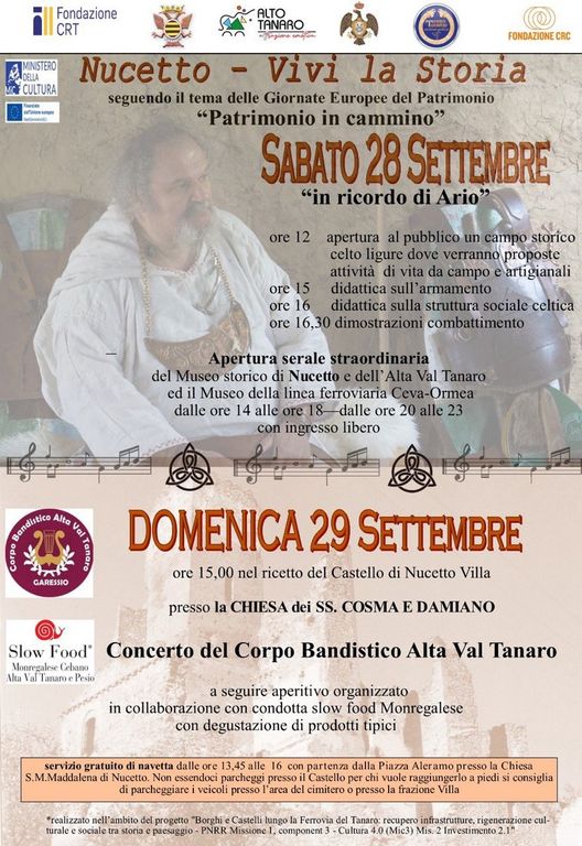 Sabato 28 settembre presso l'area esterna del parco museale di Nucetto in Via lungo Tanaro 3, presso l'ex stazione ferroviaria, con la collaborazione del gruppo storico dell'Associazione Terra Taurina di Torino, verrà proposta, nel ricordo di "Ario" druido del gruppo che da due anni è venuto a mancare e a cui è stata dedicata una parte della sala celto-ligure del Museo di Nucetto, la ricostruzione di un campo celto-ligure dell'età del ferro, dove verranno svolte le seguenti attività: dalle ore 12 l'apertura del campo storico con momenti di vita da campo e attività artigianali, alle ore 15 didattica sull’armamento, alle ore 16 didattica sulla struttura sociale celtica e a seguire dimostrazioni combattimento.