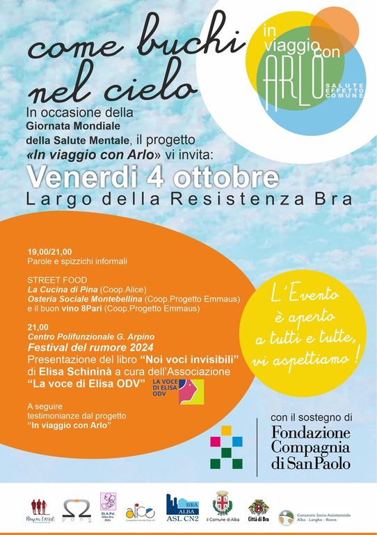 “Come buchi nel cielo” è in programma venerdì 4 ottobre, dalle ore 19 (ingresso gratuito) nel centro G. Arpino di Bra. L’occasione è la celebrazione della Giornata della salute mentale (che ricorre il 10 ottobre) all’interno della cornice di “In viaggio con Arlo”, progetto realizzato da numerosi partner pubblici e privati con il sostegno della Fondazione Compagnia di San Paolo.
