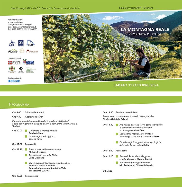 Grazie alla colaborazione con il CeST (Centro Studi Cultura e Territorio), presieduto dal giovane biologo di Dronero Matteo Tolosano, è nato il progetto Alpivive. Sabato 12 ottobre la sede AFP di Dronero ospiterà “La montagna reale”: un'importante giornata di studi aperta dall'assessore regionale alla Montagna Marco Gallo e con la partecipazione di relatori di carattere internazionale.