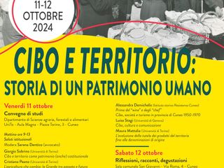 Nei giorni di venerdì 11 e sabato 12 ottobre si svolgerà a Cuneo l’evento “Cibo e territorio: storia di un patrimonio umano”, organizzato dal Dipartimento di Scienze Agrarie, Forestali e Alimentari dell’Università di Torino insieme al Dipartimento di Giurisprudenza della stessa Università e all’Istituto Storico della Resistenza e della Società Contemporanea della provincia di Cuneo.