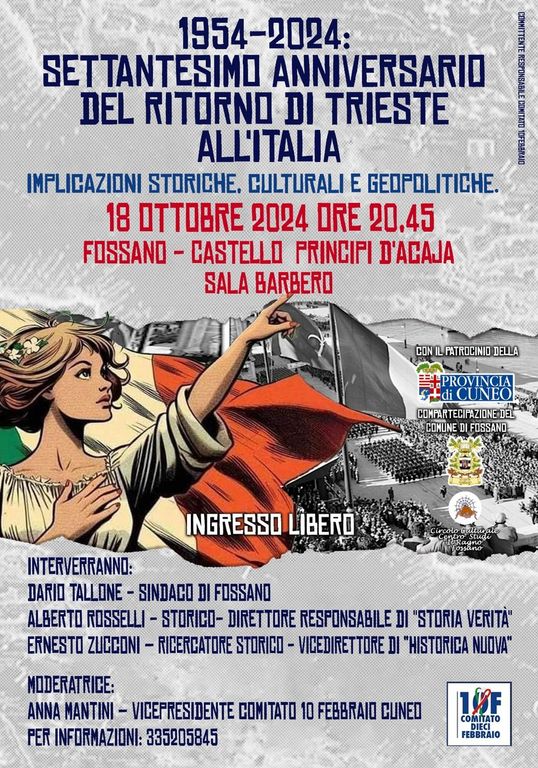 Il 26 ottobre del 2024 si celebrano a Trieste e in tutta Italia i 70 anni del definitivo ritorno di Trieste alla madrepatria Italia: ’26 ottobre 1954′. In occasione di tale ricorrenza il Comitato 10 Febbraio di Cuneo - l'associazione culturale che prende il nome dal “Giorno del Ricordo dei martiri delle Foibe” - organizza una conferenza storico-commemorativa, per focalizzare l’attenzione sulle implicazioni storiche, culturali e geopolitiche della vicenda che hanno inciso fortemente sull’evoluzione dei costumi della Trieste di quegli anni e offrire un'occasione per riflettere sul concetto di Patria e Nazione.