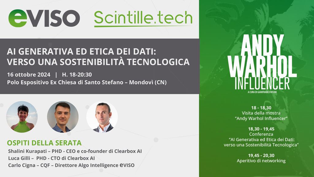La serata sarà introdotta da Carlo Cigna, Direttore Algo Intelligence di eVISO, che darà il benvenuto agli ospiti e aprirà il dibattito su trasparenza, responsabilità e impatto sociale dell’intelligenza artificiale. Successivamente, prenderanno la parola Shalini Kurapati, PhD, CEO e Cofounder di Clearbox AI, che affronterà il tema "Etica e sostenibilità nell'intelligenza artificiale: Un approccio data-centric", spiegando come un uso consapevole dei dati possa contribuire a uno sviluppo più responsabile e trasparente dell’AI. A seguire, Luca Gilli, CTO di Clearbox AI, con la presentazione "Intelligenza Artificiale Generativa: le sfide a venire", offrirà una panoramica sulle principali sfide tecnologiche ed energetiche dell’AI generativa, analizzando le nuove frontiere della creazione automatica di contenuti.