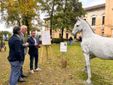 È a grandezza naturale, alto 1 metro e 60 al garrese, il bianco destriero plasmato dall’artista piozzese Franco Sebastiano Alessandria in onore di Marengo, il cavallo preferito da Napoleone.