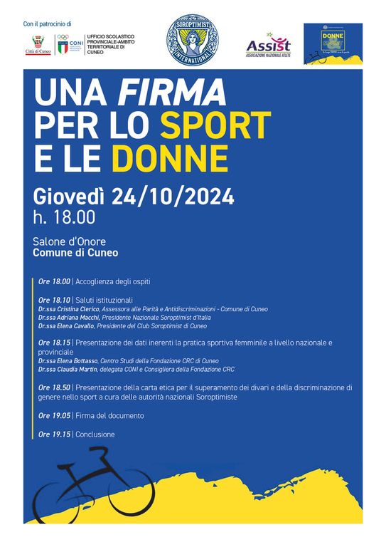 La Presidente del Soroptimist di Cuneo così si esprime: “Siamo orgogliose di poter sottoscrivere questo documento molto importante, che nasce per la tutela dei diritti delle atlete ed ha tra i suoi obiettivi: la sensibilizzazione sui temi riguardanti le pari opportunità e i diritti nello sport, l’utilizzo di un linguaggio di genere inclusivo e la promozione della cultura sportiva in generale. Saranno con noi le Autorità nazionali del Soroptimist: la Presidente Adriana Macchi e la Program Director Nazionale Rita Chiappa.
