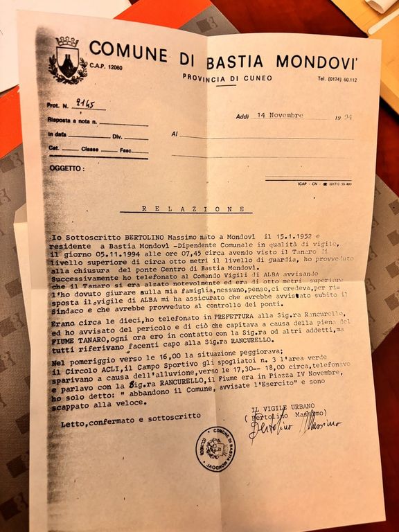 Il primo a dare l'allarme fu Massimo Bertolino, vigile urbano scomparso nel 2015, che nella relazione sui tragici eventi scriveva: "Alle 18 telefonavo alla signora Rancurello, il fiume era in piazza IV Novembre, ho solo detto: 'Abbandono il Comune, avvisate l'Esercito. E sono scappato alla veloce".