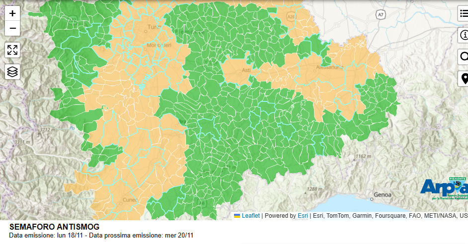 Il semaforo antismog è tornato in funzione dal 15 settembre per limitare le emissioni di gas inquinanti e consentire un miglioramento della qualità dell’aria. Il semaforo viene aggiornato da ARPA Piemonte 3 volte la settimana (lun-mer-ven) ed è consultabile alla pagina web https://webgis.arpa.piemonte.it/aria_piemonte/index.html?page=semaforo