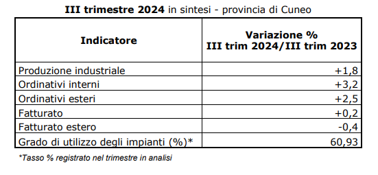 Nel III trimestre 2024 la variazione positiva della produzione industriale è stata accompagnata dal buon incremento degli ordinativi interni (+3,2%) e da quelli esteri che sono saliti del 2,5% benché il fatturato estero sia diminuito dello 0,4%. Il fatturato complessivo ha registrato un +0,2%. Il grado di utilizzo degli impianti si è attestato al 60,93%.