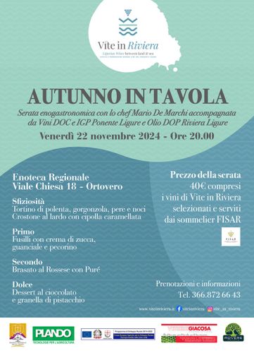 Per quanto riguarda le iniziative di Vite in Riviera, da segnalare l’appuntamento di domani, venerdì 22, presso l’Enoteca Regionale di Ortovero (Sv) con la serata enogastronomica “Autunno in tavola” curata dallo chef Mario De Marchi. Il menù della serata prevede due antipasti (tortino di polenta, gorgonzola, pere e noci; crostone al lardo con cipolla caramellata), un primo (fusilli con crema di zucca, guanciale e pecorino), un secondo (brasato al Rossese con purè) e un dolce (dessert al cioccolato e granella di pistacchio), il tutto accompagnato dai vini delle aziende di Vite in Riviera, selezionati e serviti dai sommelier Fisar. Prezzo della cena: 40 euro, vini inclusi. Posti limitati, prenotazione obbligatoria al 366.8726643.