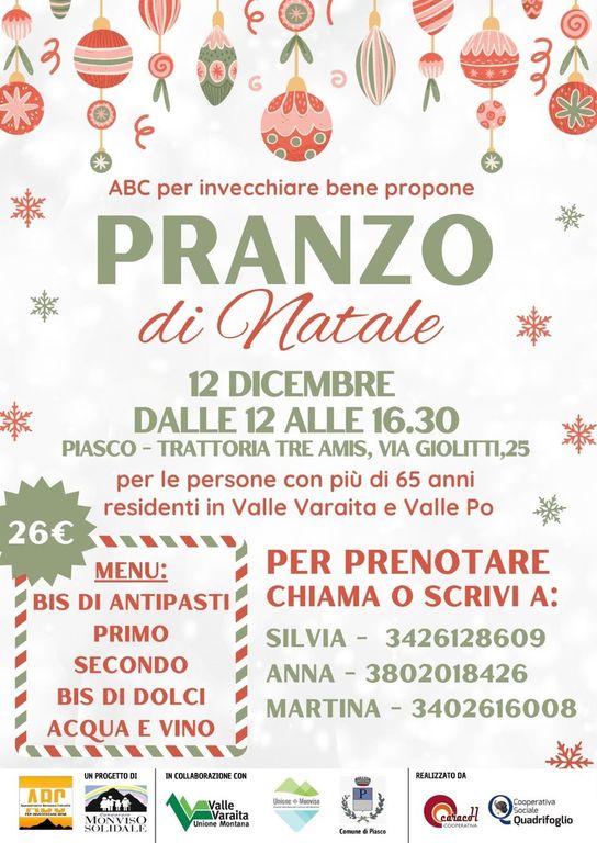 Anche quest’anno, nell’ambito delle iniziative legate all’invecchiamento attivo nelle valli del Saluzzese viene riproposto il pranzo di Natale, tradizionale occasione per passare insieme un momento di convivialità e per scambiarsi gli auguri in vista delle festività. Il pranzo si terrà giovedì 12 dicembre alla trattoria Tre Amis di Piasco, indicativamente dalle ore 12 alle ore 16.30.