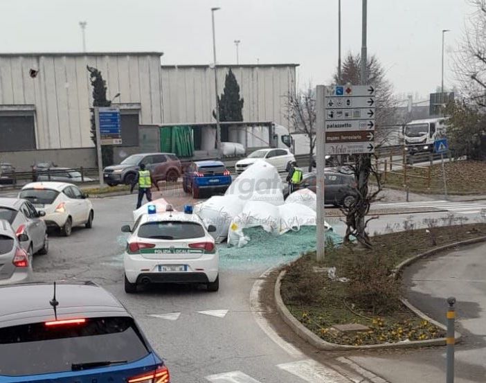 Mezzo pesante perde il carico all'ingresso di Savigliano, traffico in tilt