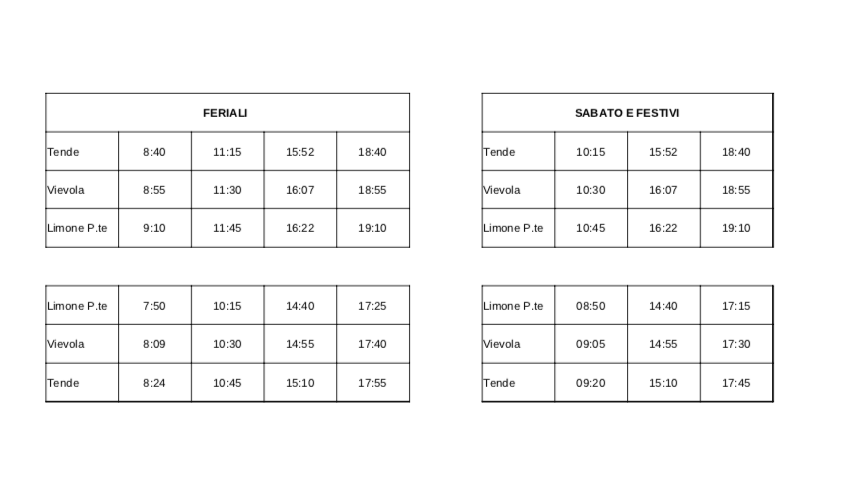 Dal 30 dicembre, tutti i giorni, saranno 6 le coppie di navette ferrovie Limone-Tenda (12 collegamenti) che si aggiungono alle 4 coppie dei treni Cuneo-Ventimiglia (8 collegamenti) già previsti dall’orario invernale. Il servizio è gestito da Regione Piemonte, con il sostegno di Region du Sud, in collaborazione con Agenzia della Mobilità, Rfi e Trenitalia.
