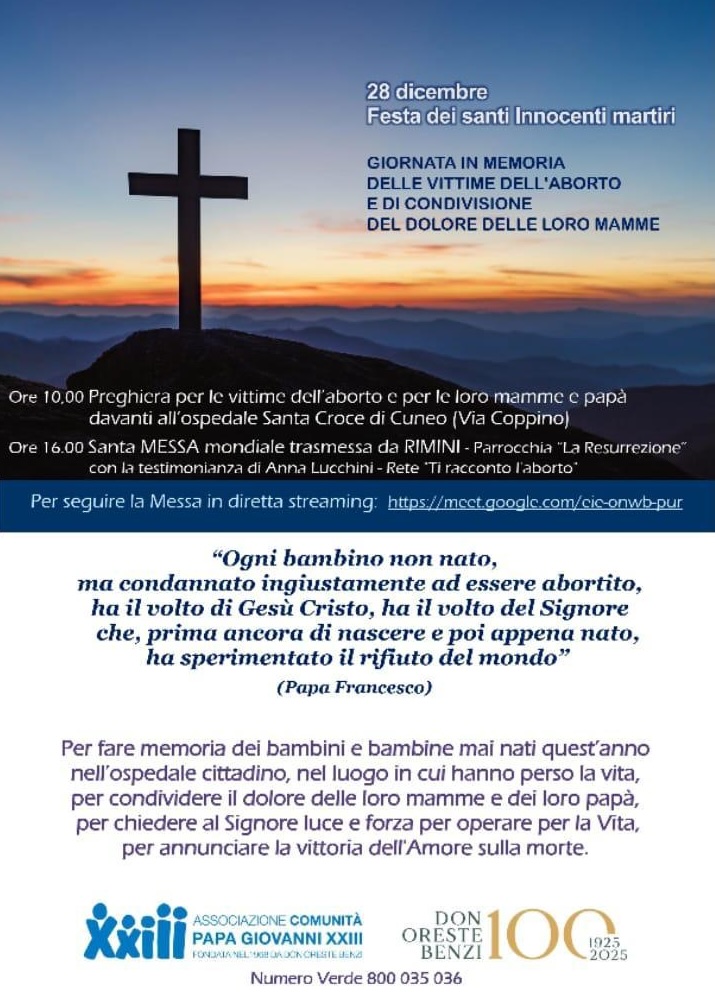 A Cuneo domani mattina alle 10 davanti all'ospedale S.Croce e Carle in via Michele Coppino si inizierà con un momento di raccoglimento e preghiera per le vittime dell'aborto e per le loro mamme e papà. Alle 16 sarà poi celebrata la santa messa mondiale trasmessa da Rimini.