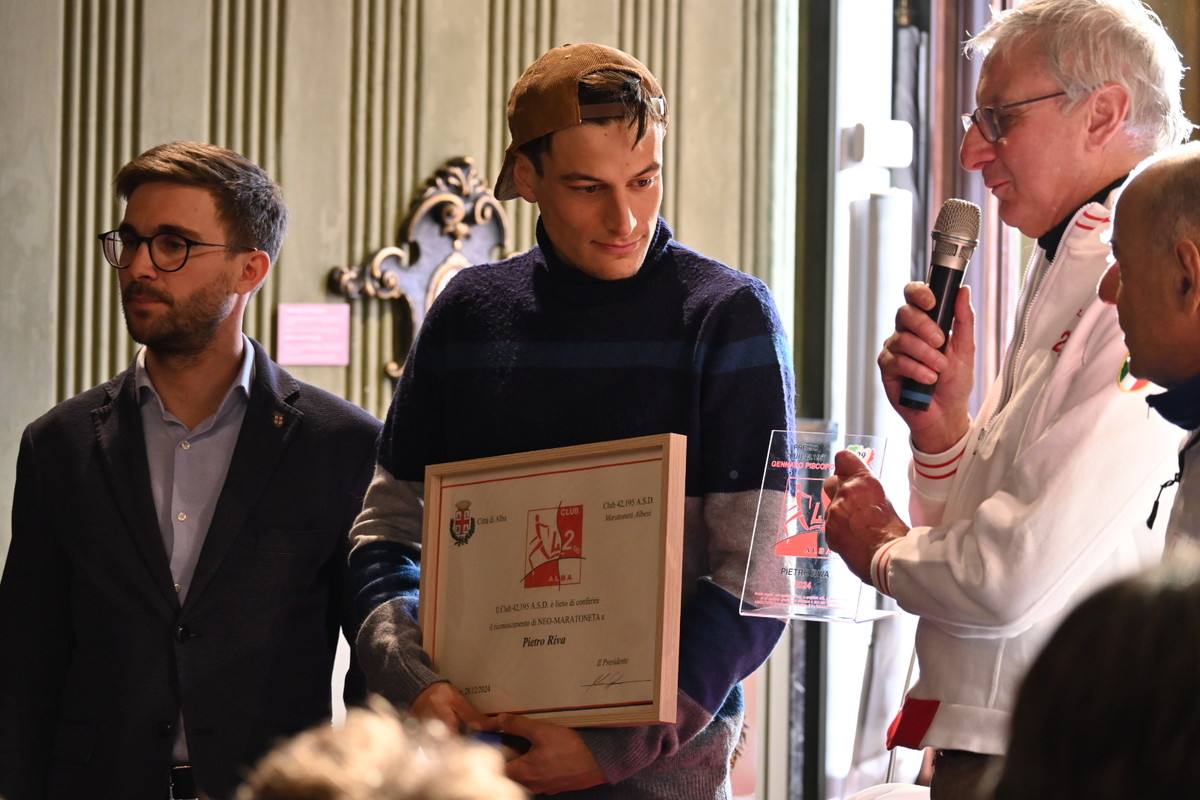 Dopo i saluti e gli interventi dei diversi ospiti, l’Amministrazione ha consegnato al campione un attestato con su scritto: “L’Amministrazione comunale a Pietro Riva, orgoglio albese e campione internazionale, a conclusione di un 2024 eccezionale con la conquista dei seguenti risultati: argento europeo individuale nella mezza maratona, oro europeo a squadre nella mezza maratona, campione italiano nei 10.000 metri piani, campione italiano di mezza maratona, miglior italiano di sempre all’esordio in una Maratona”.