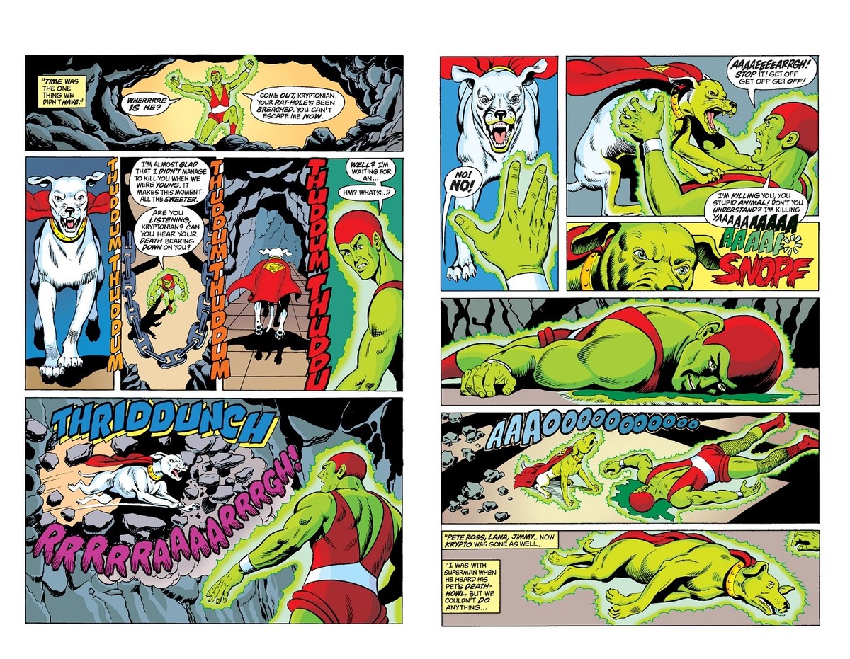 Un’altra versione dice che bambino e cane fecero il viaggio insieme, ma insomma, il punto è che Krypto ha acquisito gli stessi poteri del padrone… e lo stesso punto debole. Tant’è che Alan Moore, nel 1986, nella storia intitolata “Che cosa è successo all’uomo del domani” fa morire eroicamente il cane mentre cerca di salvare il suo padrone dall’attacco dell’Uomo Kryptonite.