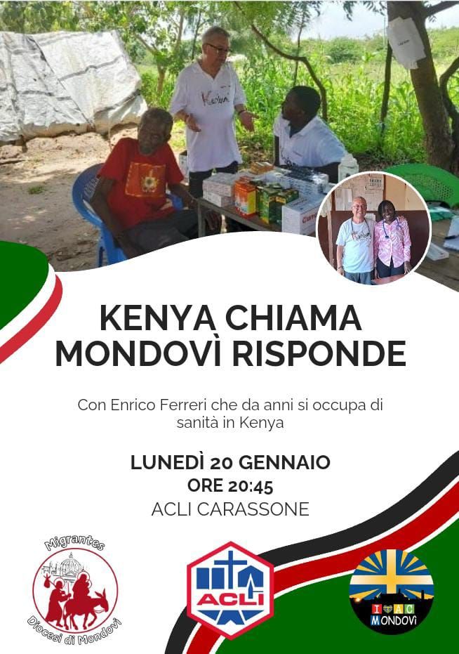 Lunedì 20 gennaio, alle ore 20.45, presso il circolo ACLI di Carassone-Mondovì, si terrà un incontro dal titolo "Kenia chiama Mondovì risponde" a cura del dott. Enrico Ferreri, volontario dell'organizzazione non governativa Karibuni Como ODV, che parlerà del suo impegno e della situazione sanitaria in quel paese.