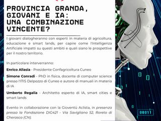 I temi affrontati nella mattinata saranno quelli scelti dai giovani in base alle loro esperienze accademiche e professionali, nonché in base ai loro interessi. In particolare, si discuterà di agricoltura, educazione, smart lands e smart cities. Con Enrico Allasia, presidente di Confagricoltura Cuneo e Regionale, si discuterà dell’implementazione dei sistemi di I.A. in ambito agricolo, e si proverà a capire quali opportunità e rischi si porranno per il comparto.