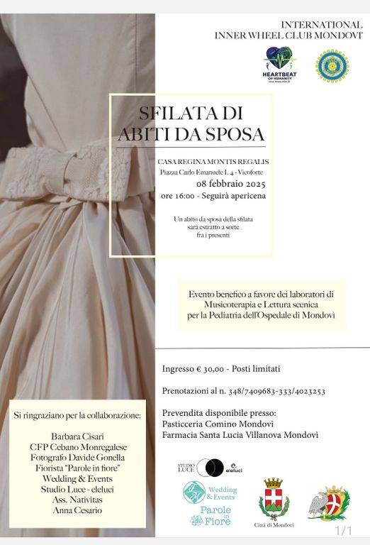 “I quindici abiti da sposa di grandi firme - spiegano dal sodalizio -, sfileranno grazie a giovani modelle monregalesi e potranno, tramite elargizioni spontanee, essere prenotati e ritirati al termine dell’evento. Seguirà apericena”.