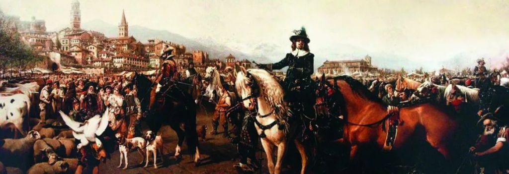L'opera ritrae uno stupefacente giorno di fiera della ex capitale Marchesato collocato nel 1600, popolato di animali, cavalieri, commercianti, contadini intenti a fare mercato sullo sfondo della città marchionale, sovrastata dal profilo del Monviso e dalla catena delle Alpi.