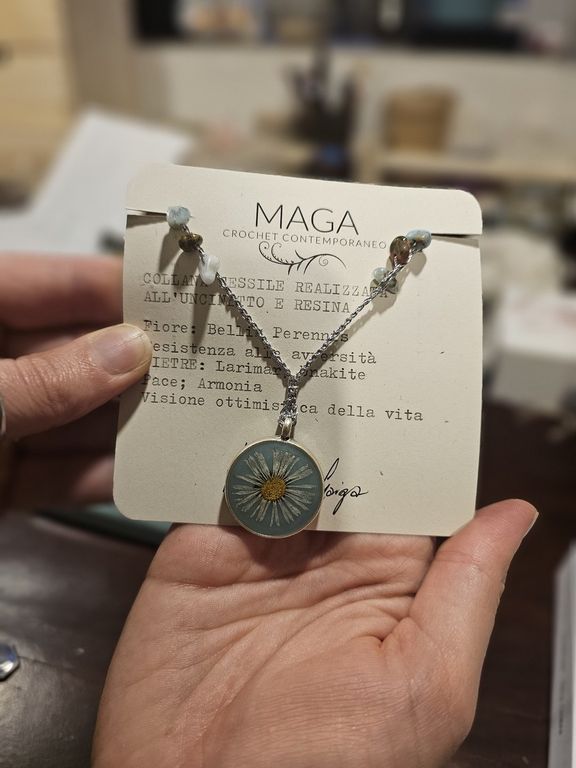 Non solo si è riscoperta un’eccellente artigiana, ma ha scelto di lavorare con materiali particolari ed ecosostenibili, come la fibra di eucalipto, il bambù, il banano e il lino. Oltre ai capi di abbigliamento, realizza gioielli unici: collane e bracciali all’uncinetto, arricchiti con pietre particolari, ognuna con un proprio significato. In primavera raccoglie fiori di campo e li ferma nella resina per fare dei ciondoli speciali.