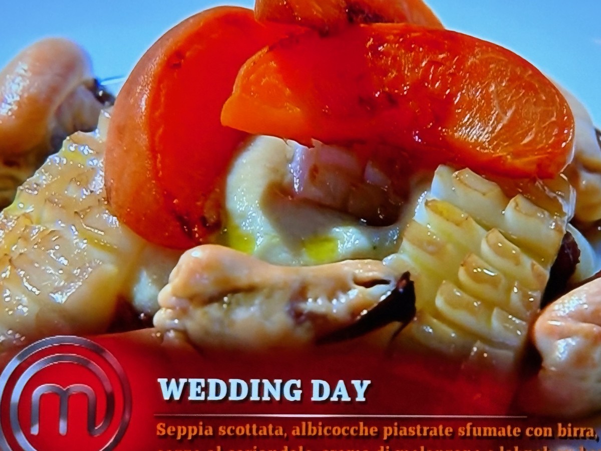 Ma andiamo con ordine. Simone ha stradominato la Mistery Box iniziale, con un piatto a base di seppia scottata e albicocche sfumate con la birra che ha voluto chiamare "Wedding Day": "Perché a me i matrimoni piacciono tanto", ha spiegato.