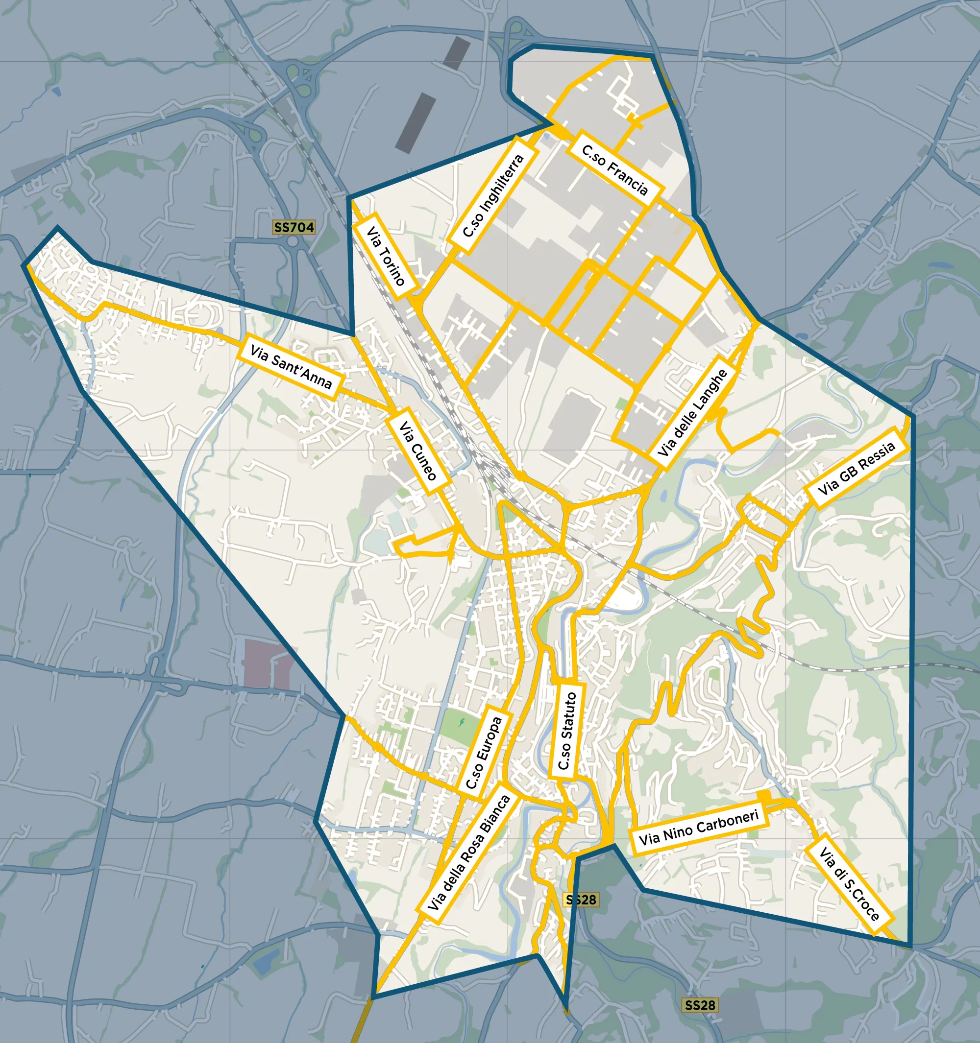 via Torino, via Cuneo, via Tanaro, via Langhe, via I° Regg. Alpini, p.zza Mellano, via Cornice, via Einaudi, ponte Cavalieri d’Italia, c.so Statuto, via Calleri, viale Vittorio Veneto, via Rosa Bianca, P.zza Ellero, via Silvestrini, via Fracchia, via Nuova, via Botta, via Ressia, via Tortora, via Carboneri, via Santa Croce, via S. Anna, via Momigliano, via A. Moro, ponte Madonnina, via Perotti, via Caduti sul lavoro, corso Inghilterra, corso Francia, corso Milano, corso Firenze, via Venezia, via Genova, via Aosta, via Trento, via Mantova, via Gratteria, via Borgo Crociera, via del Capris, via Follone, via Vecchia di Frabosa, via dell’Annunziata, piazza Borgato, via Vigevano, via Diaz, piazza F. Centro, corso Italia, piazza Monteregale, corso Europa, piazza IV Novembre, via Ospedale, piazza d’Armi, corso Stati Uniti, via S. Rocchetto (tratto compreso tra via Cuneo e gli accessi agli Istituti scolastici, con obbligo d’ingresso ed uscita da via Cuneo), ponte Borgato, via Curazza, via Vecchia di Monastero, via Molino al Borgato, via Nallino, via Oderda, strada comunale Carassone Piazza; via S. Bernardo.