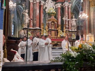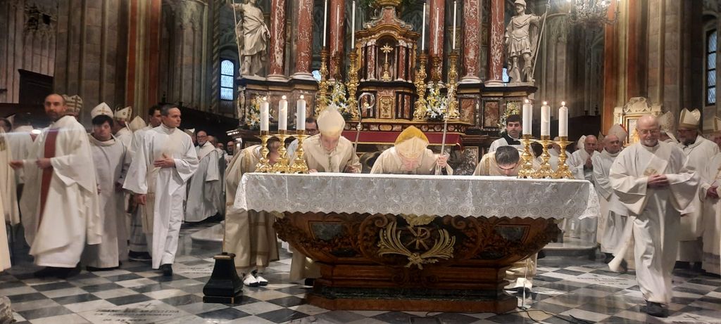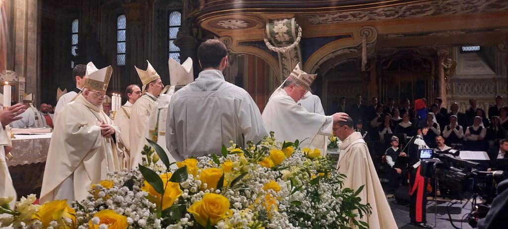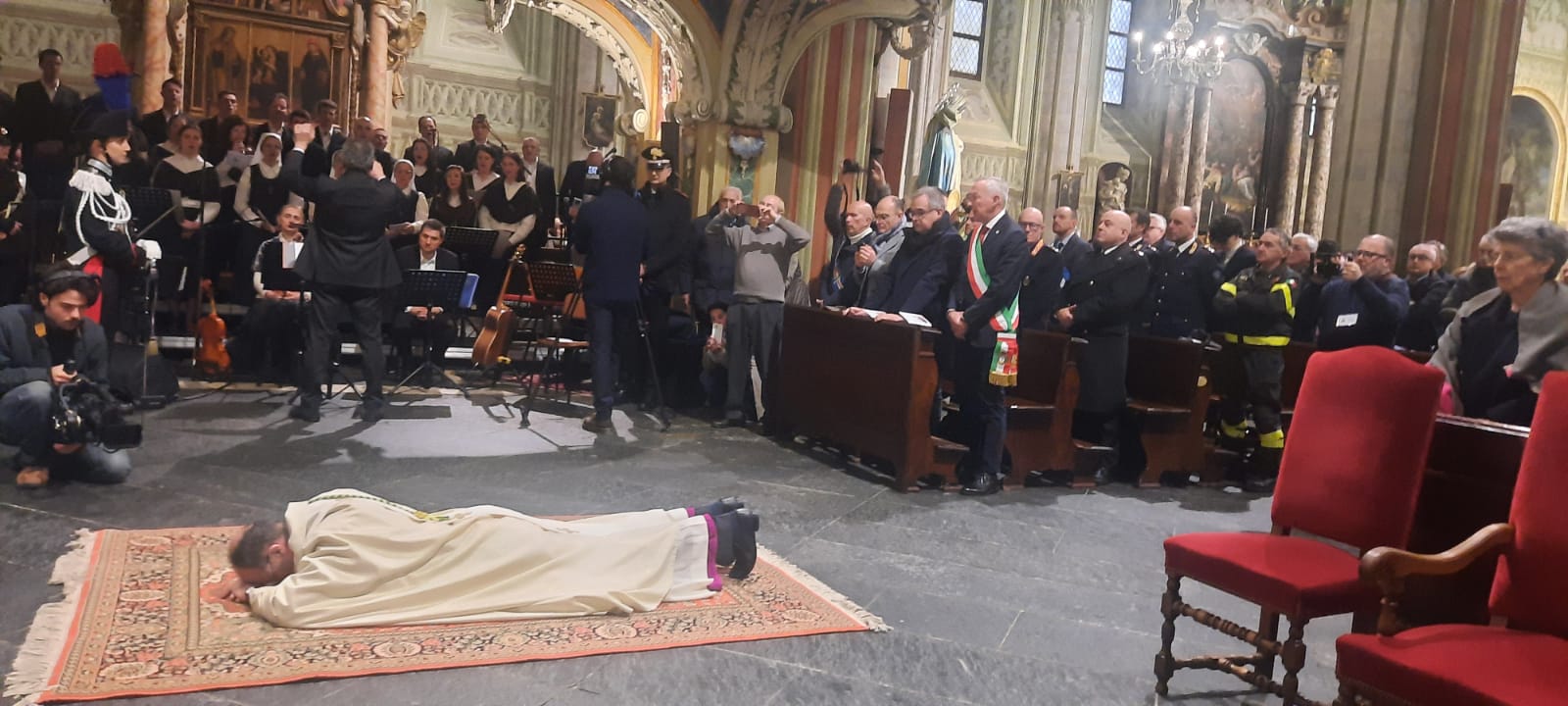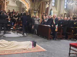 Seguendo il rito dell' antica tradizione richiesto ai candidati all’episcopato, si è quindi prostrato a terra al canto delle litanie dei santi.