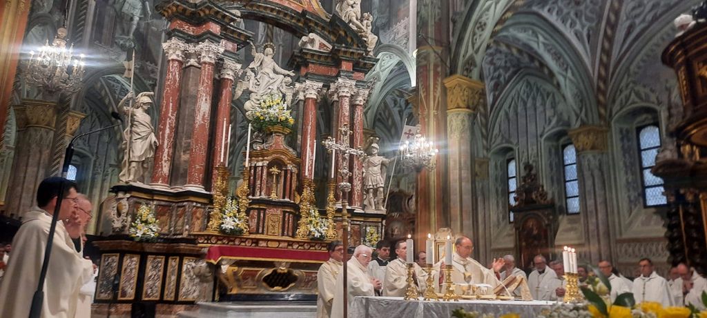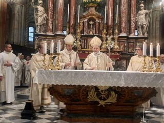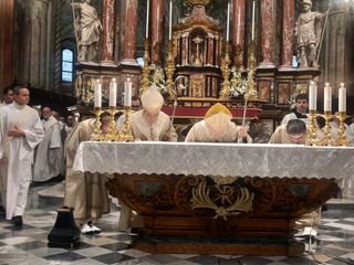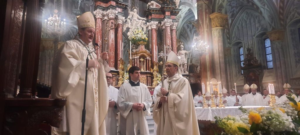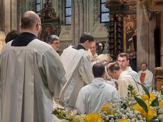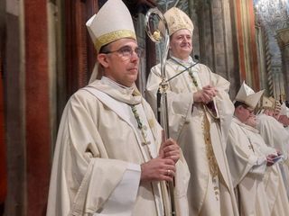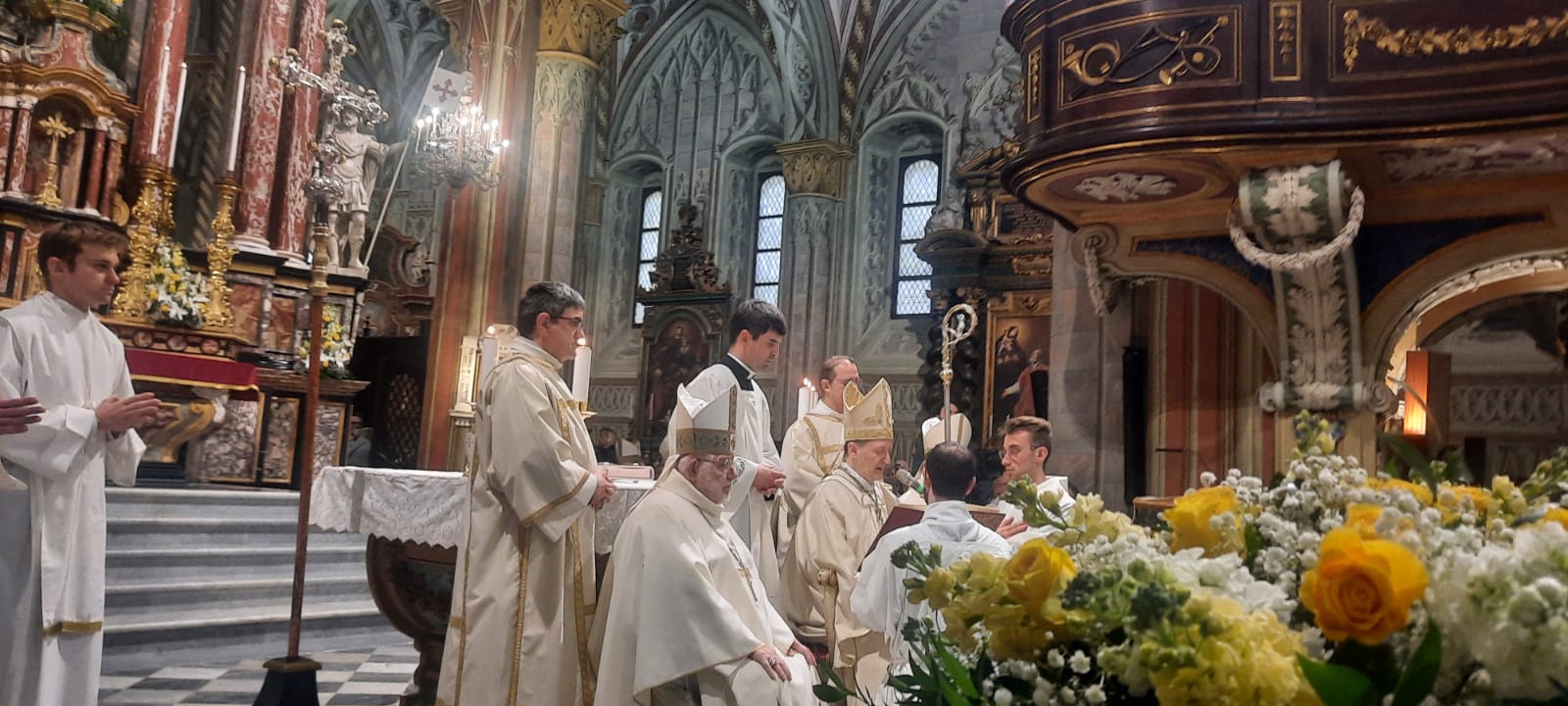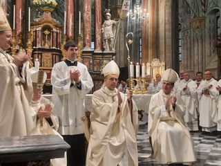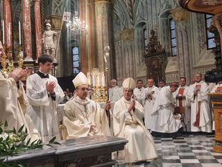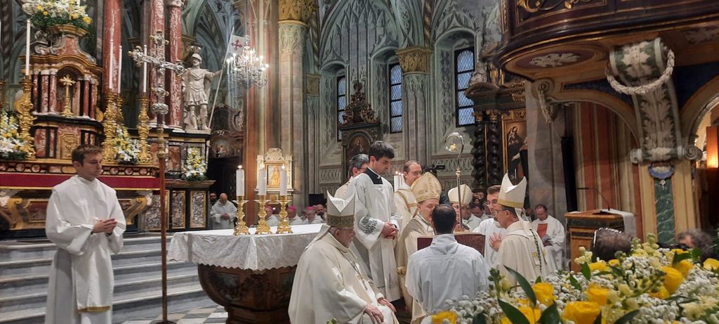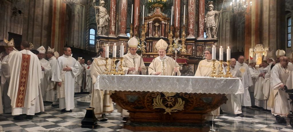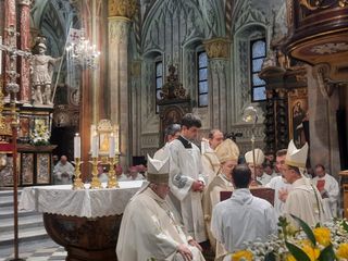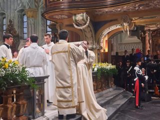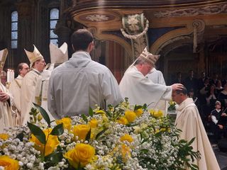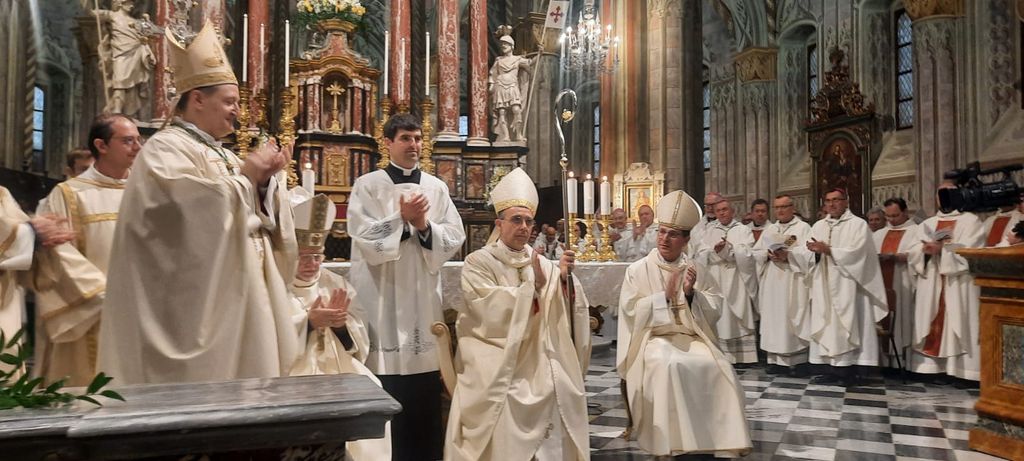 Inginocchiandosi all'altare per l’imposizione delle mani da parte dei vescovi, dopo la preghiera di ordinazione, ha ricevuto dal vescovo Bodo l’unzione del capo con il sacro crisma e quindi anello, mitra e pastorale, i simboli vescovili per eccellenza.
