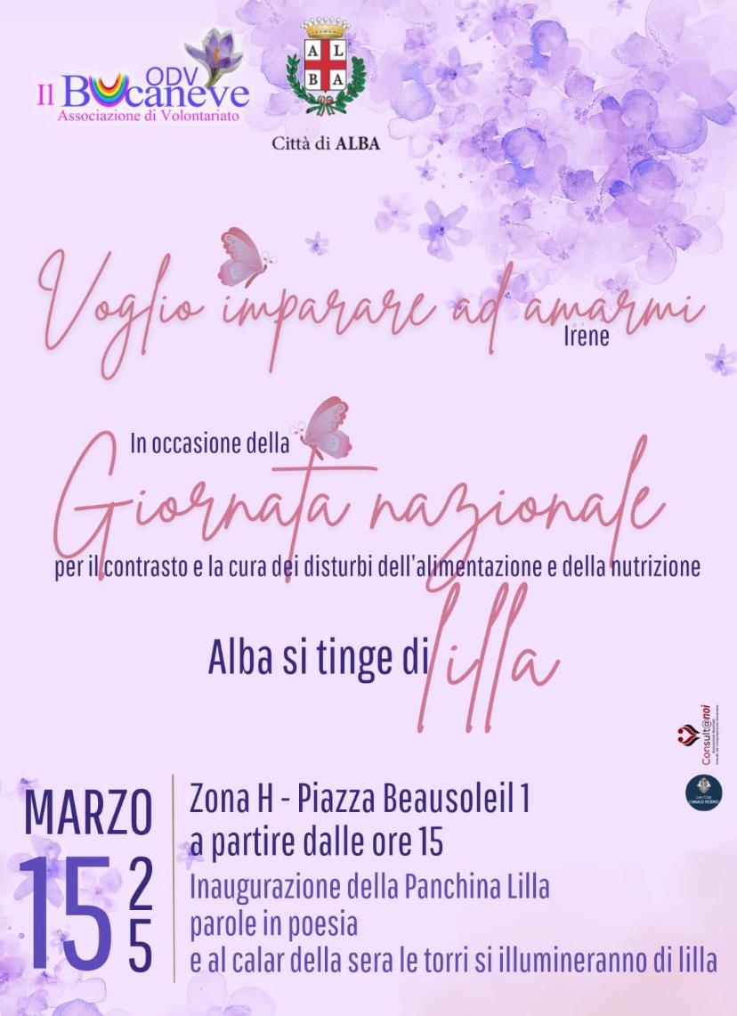 La giornata sarà dedicata alla memoria della compianta Irene Ferrero, scomparsa un anno fa a soli 23 anni, e sarà l'occasione per inaugurare la panchina lilla, un segno tangibile di speranza, di accoglienza e di sensibilizzazione verso chi affronta ogni giorno il difficile cammino dei disturbi alimentari. Un evento che vuole anche dare spazio alla riflessione e alla crescita personale, per imparare a prendersi cura di sé stessi, amarsi e superare il dolore invisibile che spesso si porta con sé la malattia.