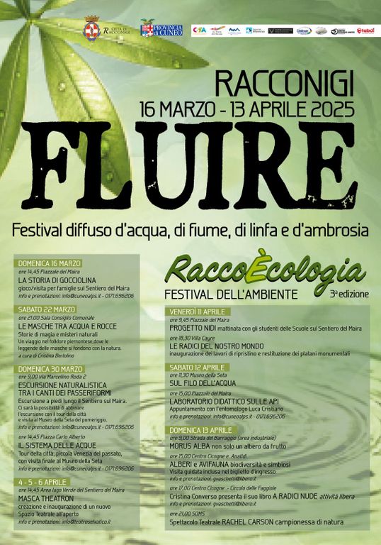 Dal 16 marzo al 13 aprile Racconigi ospiterà “Fluire - Festival diffuso d'acqua, di fiume, di linfa e d'ambrosia”, organizzato dal Comune di Racconigi, in partnership e con il patrocinio di Sul filo della seta, centro cicogne e anatidi, terre dei Savoia, parco del Monviso, provincia di Cuneo, Csea, Tabui, Conitours, Myra experience e Teatro Selvatico.