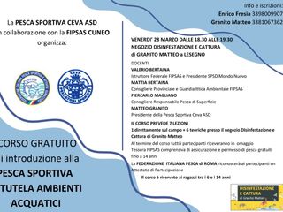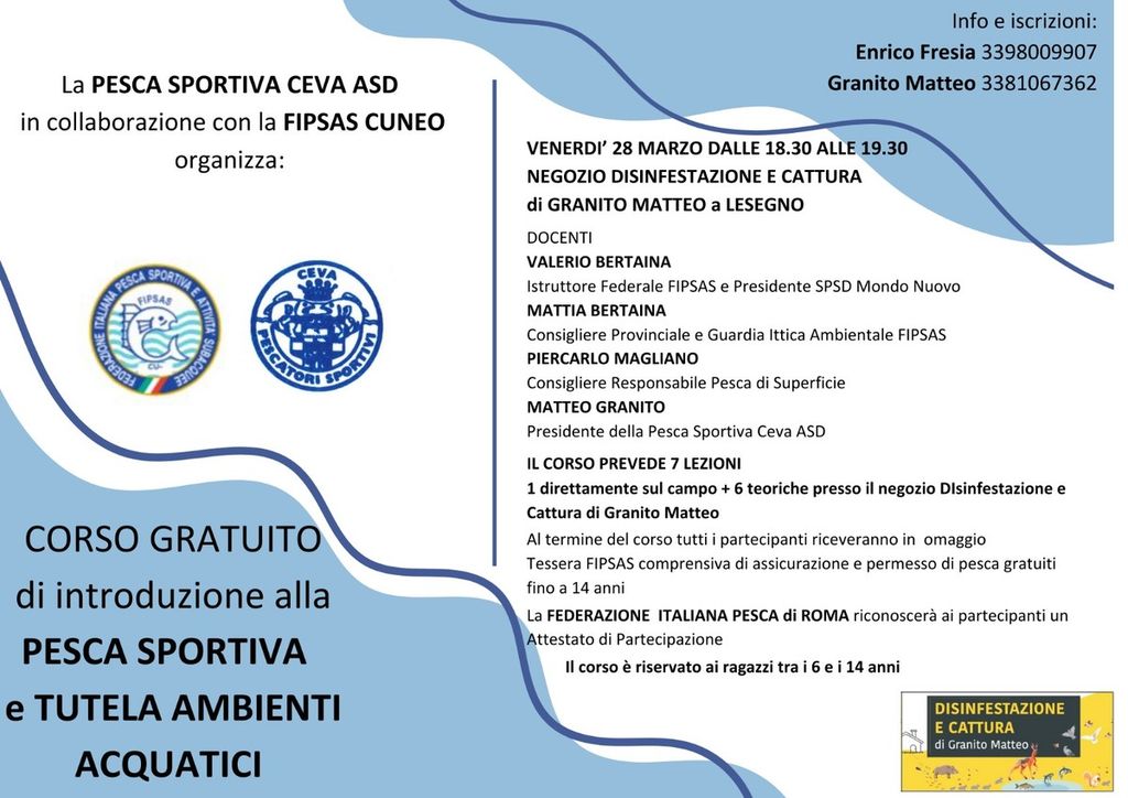 La Pesca Sportiva Ceva asd, in collaborazione con Fipsas Cuneo, organizza un corso unico e gratuito per introdurre giovani appassionati alla pesca sportiva e sensibilizzarli sulla tutela degli ambienti acquatici.