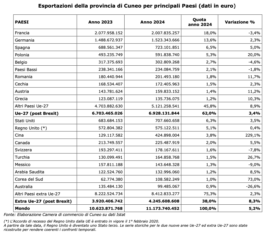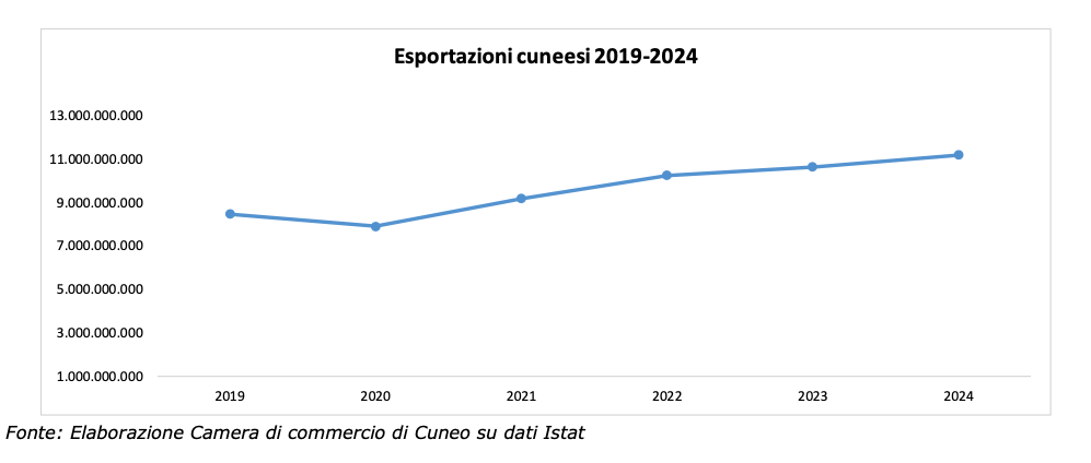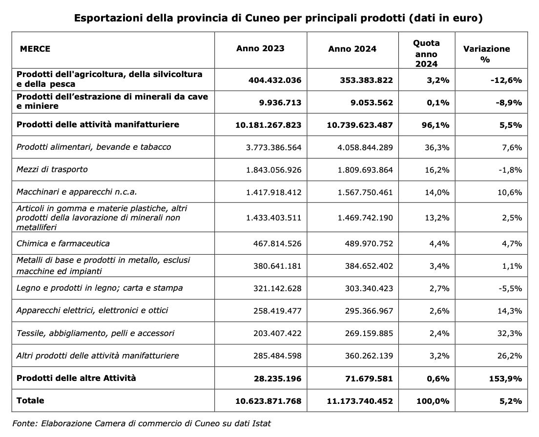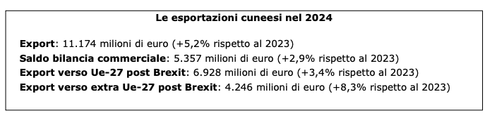 Nel 2024 il valore delle esportazioni cuneesi di merci ha ampiamente superato gli 11 miliardi di euro con una crescita del 5,2% rispetto al 2023 quando il volume delle esportazioni superò i 10 miliardi e mezzo di euro. Il Piemonte ha fatto registrare una flessione del 4,9% e il Paese dello 0,4%.