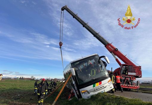 Paura a Villafalletto: pullman carico di studenti esce di strada e finisce in bilico sulla scarpata a bordo strada