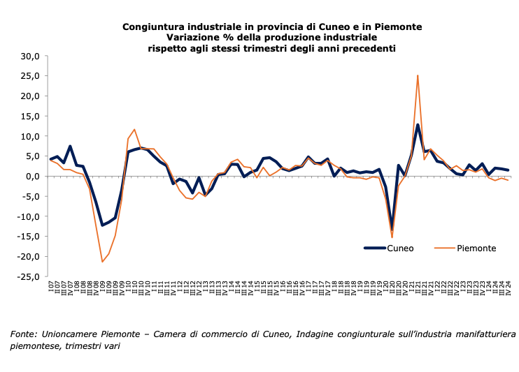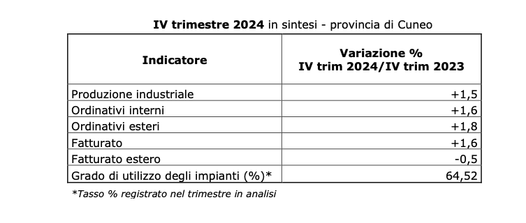 Nel IV trimestre 2024 la produzione industriale in provincia di Cuneo ha segnato una discreta crescita (+1,5%) rispetto all’analogo periodo del 2023, dato superiore rispetto a quello regionale (-1,0%). Guardando alle singole performance trimestrali del 2024, emerge quanto segue: I trimestre +0,4%, II trimestre +2,0% e III trimestre +1,8%.