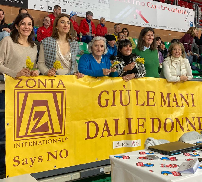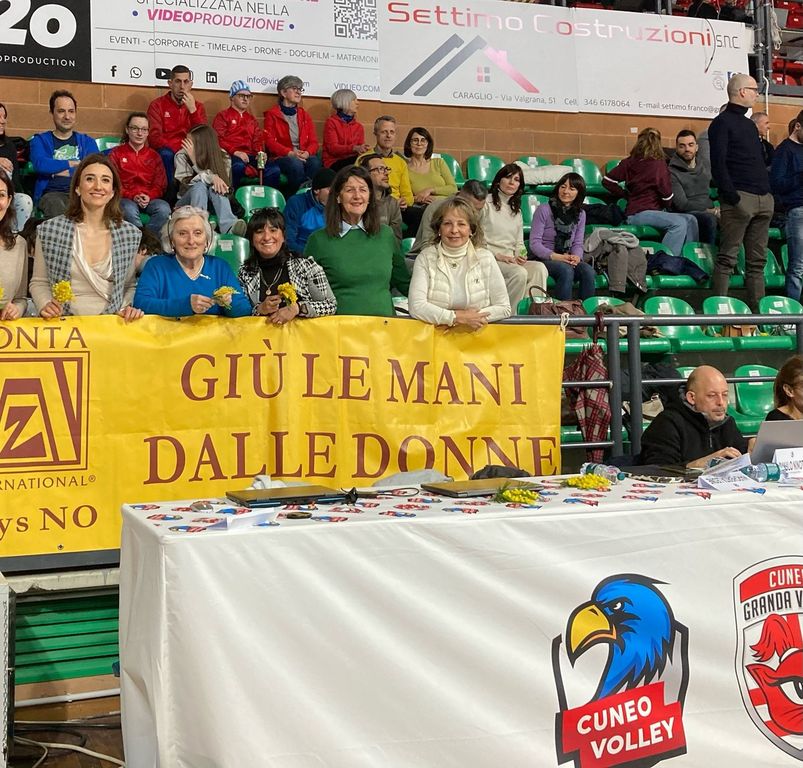 Con lo striscione “Giù le mani dalle donne” una rappresentanza del club Zonta Cuneo, era presente allo stadio ieri, domenica 9 marzo, con altri 1300 spetttatori esultanti alla partita dove la MA Acqua S.Bernardo Volley Cuneo ha vinto con convinzione sui giocatori abruzzesi dell’Abba Pineto Volley .