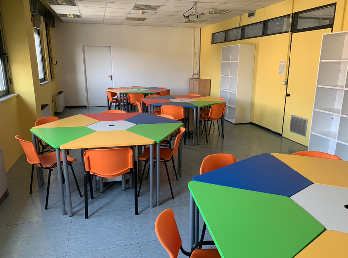 A partire dal corridoio centrale: i pannelli alle pareti sono stati rivestiti con pellicole in pvc adesive colorate. La sala polivalente, poi, è stata ritinteggiata e arricchita con nuovi arredi.