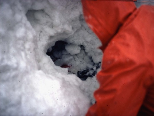 [Alberto Borgna con la sonda mentre localizza la signora Margaret. Sulla neve si vede il guinzaglio di Zacho e la bandierina rossa piantata dai soccorritori in precedenza]