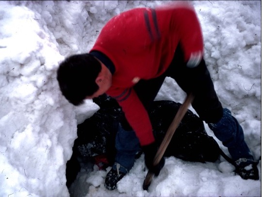 [Alberto Borgna, seguendo l'indicazione della sonda, scava con la pala mentre Zacho con le zampe insiste per continuare a cercare]
