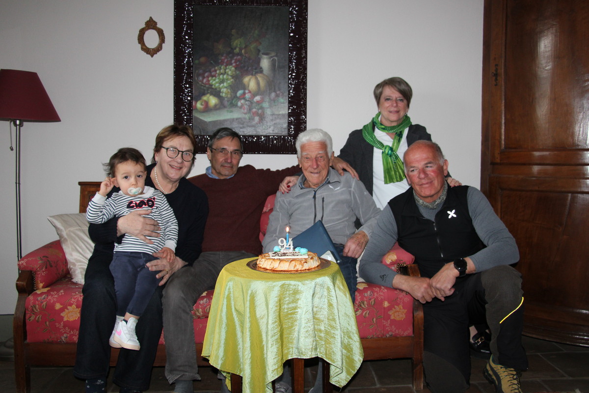 [La festa per i 94 anni di Borgna (al centro), da sinistra Paola Prucca e la sua nipotina Ginevra, Silvio Giuliano, Marina Perotti e Segio Rossi]