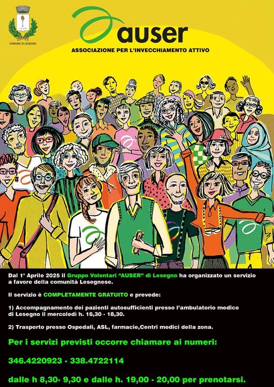 Prenderà servizio dal 1° aprile 2025 il gruppo volontari Auser di Lesegno. Si tratta di un servizio gratuito, a favore della comunità, che prevede l’accompagnamento dei pazienti autosufficienti presso l’ambulatorio medico di Lesegno - il mercoledì dalle 16:30 alle 18:30 - e il trasporto presso ospedali, Asl, farmacie, centri medici della zona.