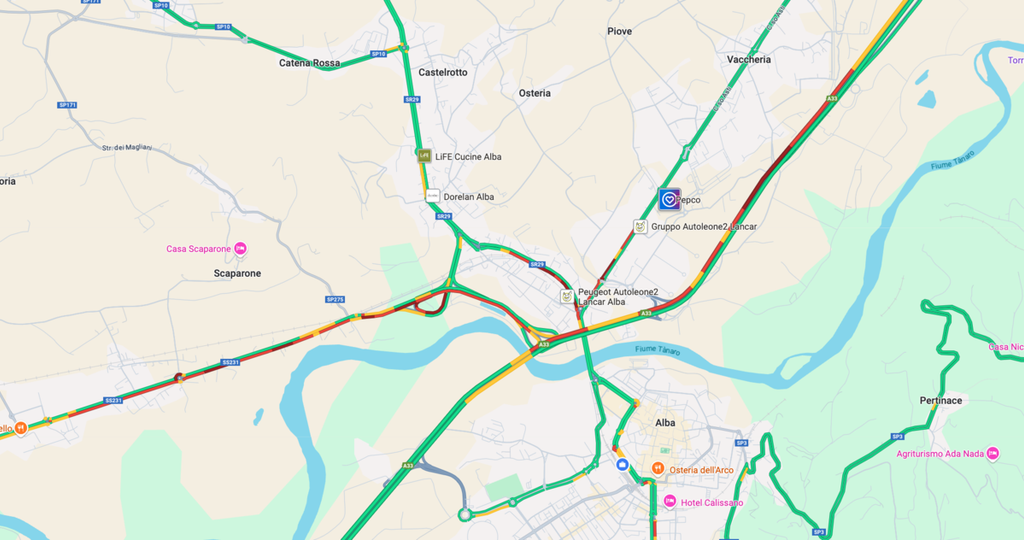 Stamattina – specialmente tra le ore 8 e le 9, con quella del pomeriggio la fascia oraria di maggiore concentrazione del traffico –, è andato in scena un nuovo assaggio della stagione di passione che attende gli albesi, con tutta la viabilità di ingresso alla città costretta ad avanzare per lunghi tratti a passo d’uomo. Come dimostrano bene le mappe in tempo reale offerte dai diversi servizi di navigazione per auto.