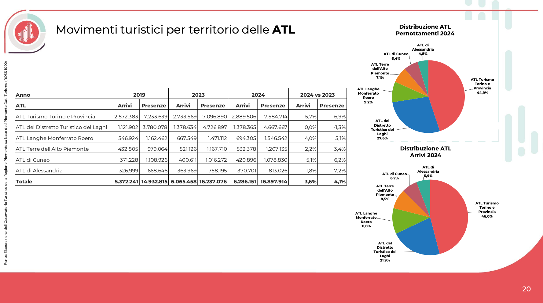 Analizzando movimenti turistici nei territori delle Agenzie Turistiche Locali (ATL), emerge una crescita diffusa in quasi tutte le aree territoriali. Quello relativo a Turismo Torino e Provincia si conferma il territorio con il maggior numero di visitatori, registrando quasi 2,89 milioni di arrivi e oltre 7,58 milioni di presenze, con un incremento del +5,7% negli arrivi e +6,9% nelle presenze rispetto al 2023. Segue il distretto turistico dei Laghi. Anche le Langhe Monferrato Roero confermano un andamento positivo, con oltre 690mila arrivi (+4%) e 1,5 milioni di presenze (+5.1%). Terre dell'Alto Piemonte registra una crescita con 530mila arrivi e 1,2 milioni, mentre nell'ATL del Cuneese - che si colloca al secondo posto per crescita percentuale - si contano 420mila arrivi (+5.1%) e quasi 1,08 milioni di presenze (+6.2%).