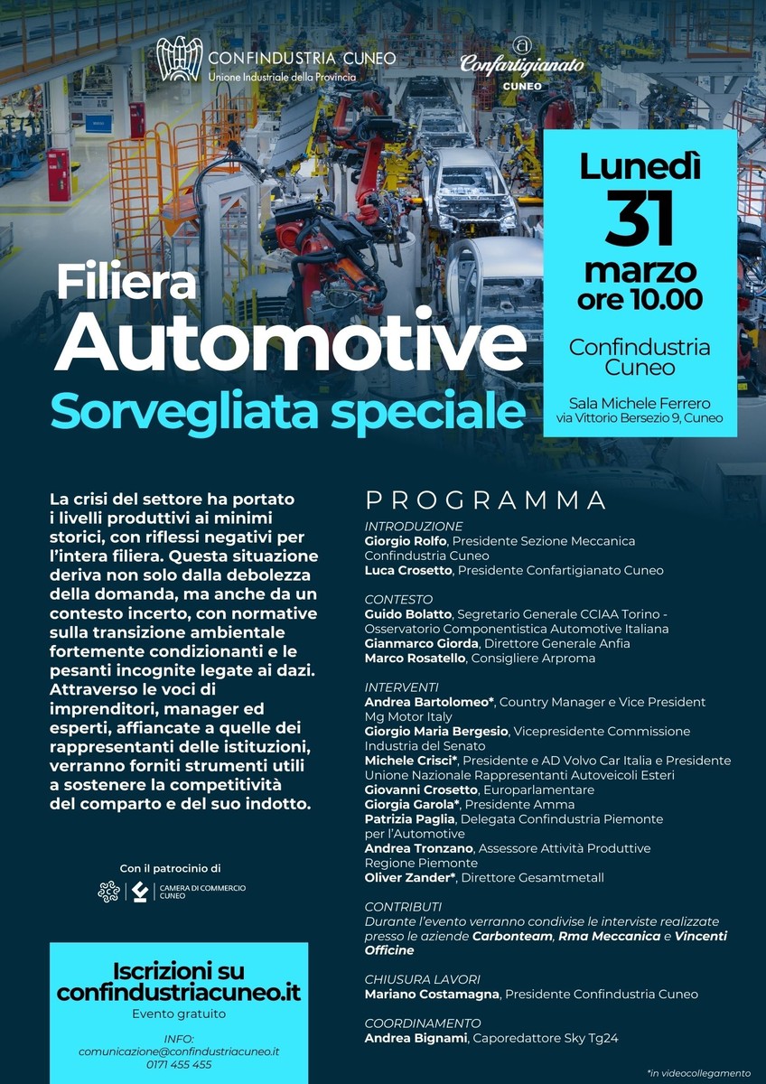 Affrontare le complessità del settore automotive e le sue ripercussioni sulla filiera è l’obiettivo dell’evento “Filiera automotive: sorvegliata speciale”. Confindustria Cuneo e Confartigianato Cuneo, con il patrocinio della Camera di Commercio di Cuneo, propongono questo importante momento di approfondimento e confronto lunedì 31 marzo, alle 10, presso la Sala “Michele Ferrero” della Casa degli industriali cuneesi, in via Bersezio 9, a Cuneo.