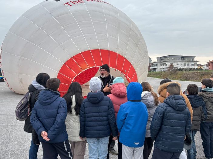 Il pilota Marco Marin, insieme al suo team, ha accolto la scolaresca nel piazzale degli Artigiani, dove i bambini hanno ascoltato con attenzione tutte le informazioni riguardanti la storia e il funzionamento di un pallone aerostatico.