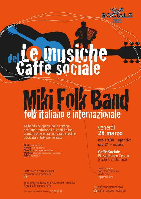 Venerdì 28 marzo il Caffè Sociale della Stazione di Mondovì si trasformerà in un palcoscenico per una serata all’insegna della musica folk. A partire dalle 19:30, il locale ospiterà la Miki Folk Band, un gruppo che unisce sonorità occitane, brani d’autore italiani e folk internazionale, per un viaggio musicale coinvolgente e dal sapore tradizionale.