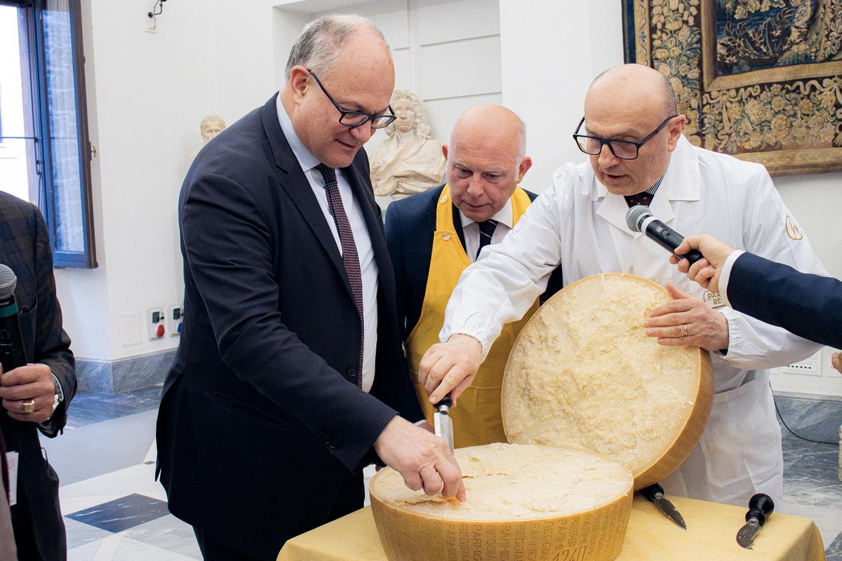 Il sindaco di Roma Capitale Roberto Gualtieri assiste al taglio della forma del Parmigiano Reggiano ad opera di Igino Morini.