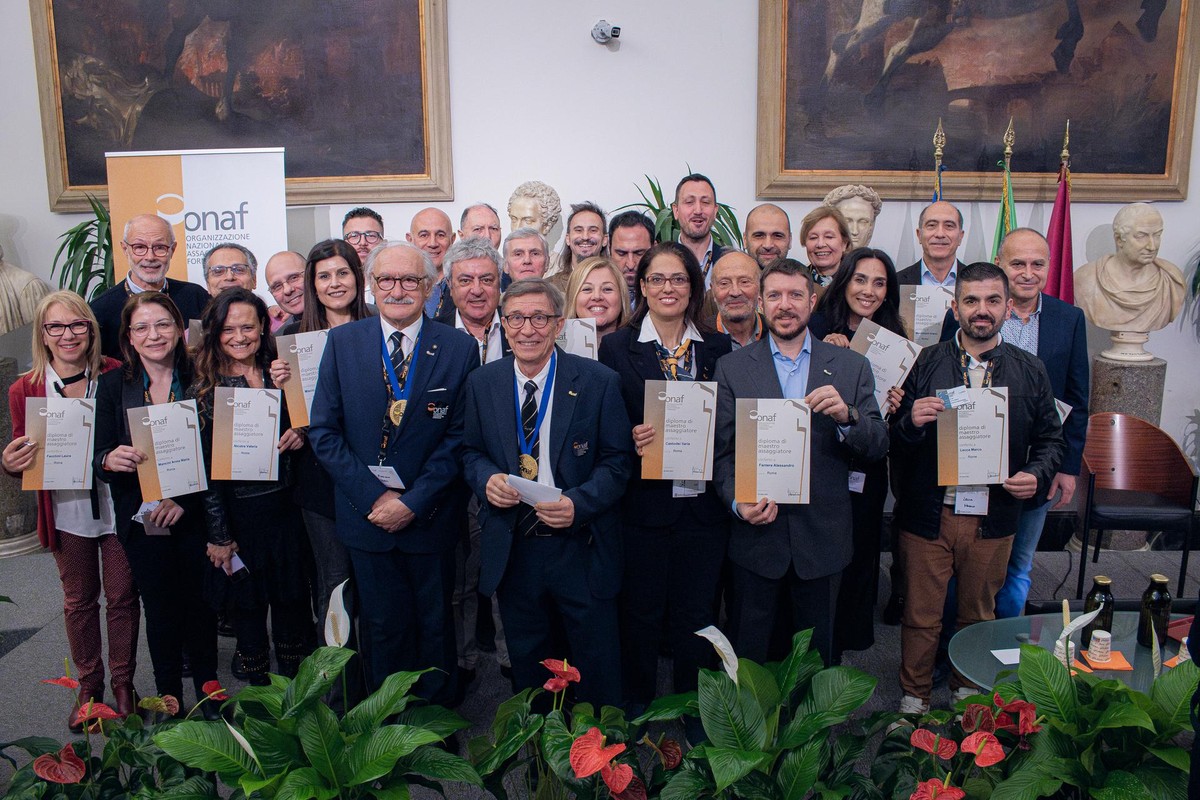 Pietro Carlo Adami e il delegato ONAF di Roma, Domenico Villani, insieme a tutti i nuovi Maestri Assaggiatori del Lazio.