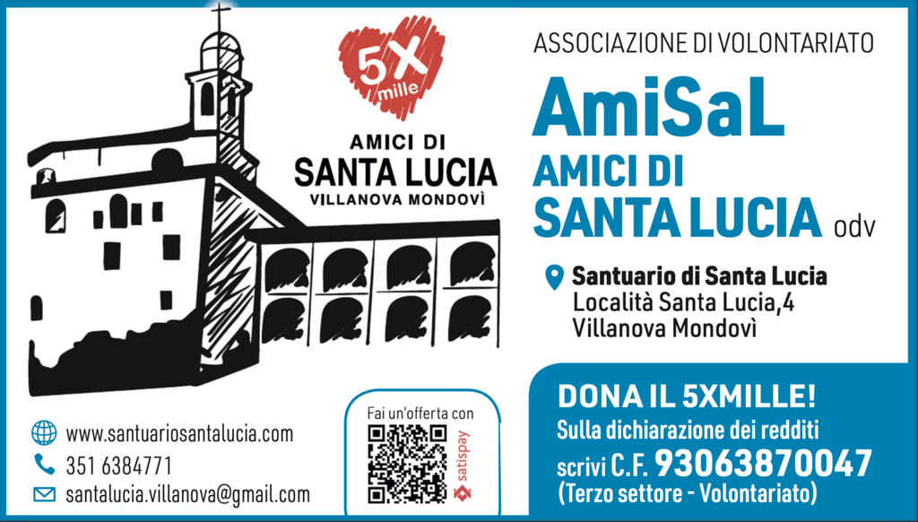 Per riferimenti, adesioni e informazioni, si può contattare l’Associazione tramite l’indirizzo e-mail (santalucia.villanova@gmail.com) o il recapito telefonico (tel./sms/whatsapp 351.6384771) o i social (pagina Facebook “Santuario di Santa Lucia – Villanova Mondovì” – pagina Instagram “santuariodisantalucia”), oppure è possibile elargire una donazione (detraibile fiscalmente) per le attività dell’Associazione e/o per i lavori di manutenzione e rinnovo locali, per mezzo di un bonifico bancario (IBAN: IT48Y0306909606100000194138).